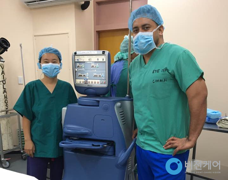 ▲ 초음파 유화술(PHACO) 기기 앞에서 김수영 지부장과 현지 안과의사 Dr. Duke