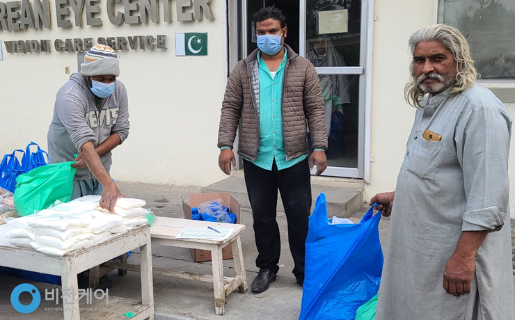 ▲ 파키스탄지부 협력병원인 UCH-Sambu Korean Eye Center 앞에서 코로나19 긴급구호 2차 물품 정리 모습