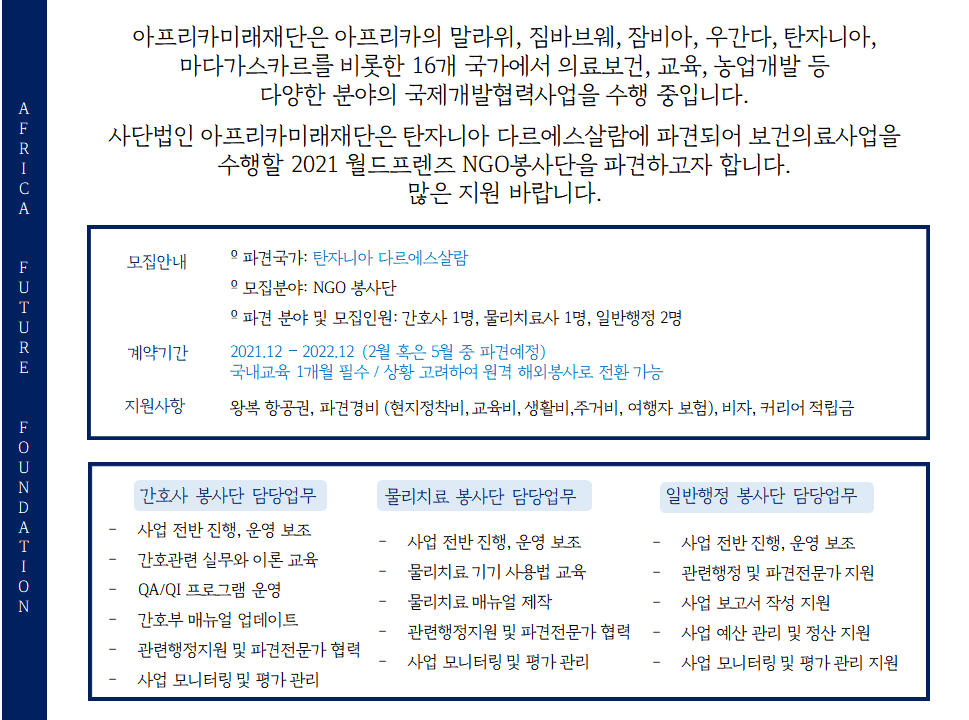[기간연장] 2021 탄자니아 무함빌리 병원 간호사·물리치료사·일반행정 봉사단 모집