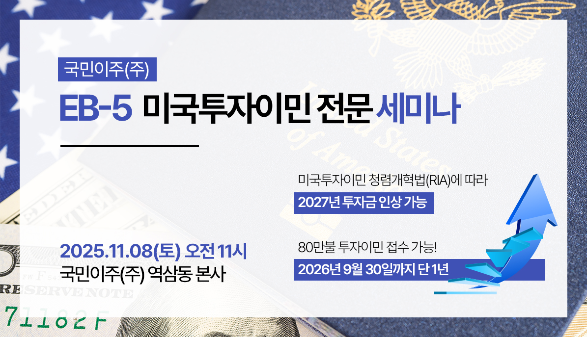 안녕하세요미국영주권 전문 기업국민이주(주)입니다.📍 일시 : 2025년 11월 8일(토) 오전 11시📍 장소 : 국민이주 본사💰80만불 투자이민 접수 가능!- 2026년 9월 30일까지 단 1년