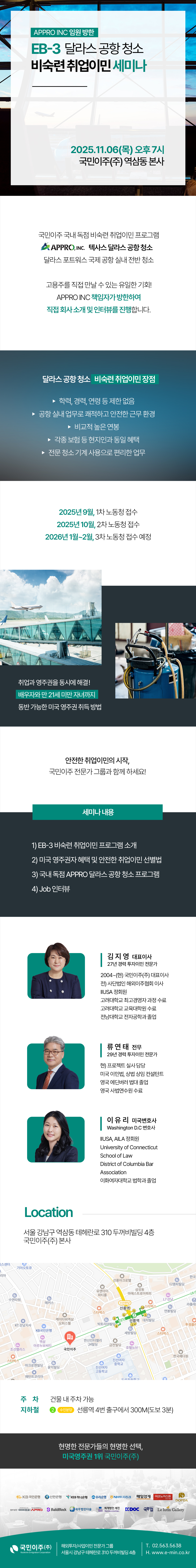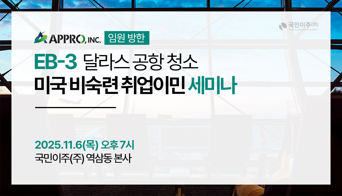 📍일시 : 2025년 11월 6일 (목) 오후 7시📍일시: 역삼동 국민이주(주) 본사🏢 APPRO 텍사스 달라스 공항 청소달라스 포트워스 국제 공항 실내 전반 청소