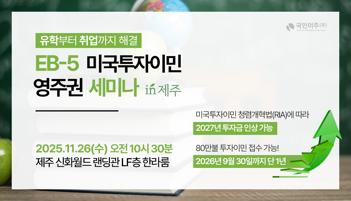 📍 일시: 2025년 11월 26일(수) 오전 10시 30분📍 장소: 제주 신화월드 랜딩관 LF층 한라룸(제주 서귀포시 안덕면 신화역사로 304번길 38)💡자녀의 내일을 위한 미국투자이민 영주권현행 80만불 미국투자이민 마감 카운트다운!미국투자이민 청렴개혁법(RIA)에 따라, 2027년 투자금 인상 예정2026년 9월 30일까지 안전하게 80만불 투자이민 접수 가능
